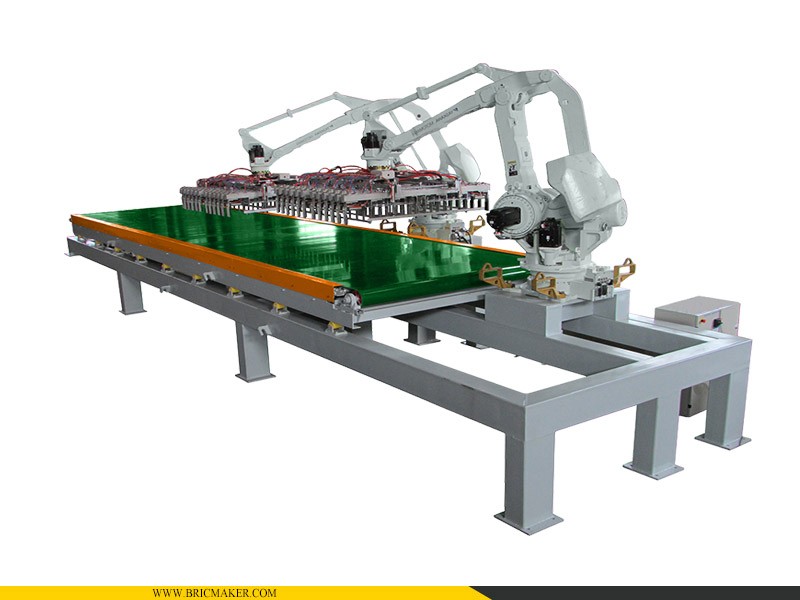 Автоматический сервоприводной ленточный робот для укладки глиняного кирпича в двойные линии используется на крупном автоматическом кирпичном заводе, где нет необходимости поворачивать сырые кирпичи на 90 градусов перед укладкой на вагон обжиговой печи. Он состоит из двух роботов, сервоприводных конвейерных лент и управления ПЛК.