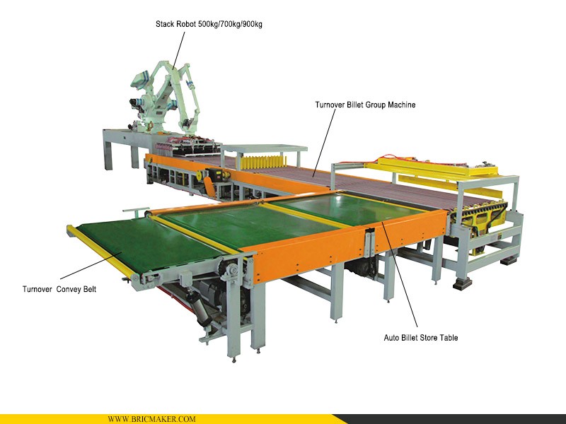 Автоматическая линия переворота и группового штабелирования сырцового кирпича применяется на современных автоматизированных кирпичных заводах. Она выполняет функции хранения, переноса, переворота, разрыва и укладки кирпича в автоматическом режиме. Весь процесс управляется ПЛК и не требует ручного труда.