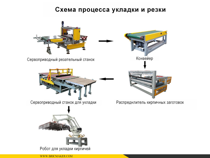 Для обеспечения производительности в 30 000 кирпичей в час: Вакуумный экструдер за один цикл формует 6 кирпичей. Резательный станок разрезает 48 кирпичей за один раз. Автоматический робот за один цикл захватывает 96 сырцовых кирпичей. Линия формования и укладки кирпичей работает непрерывно 8–10 часов в день.